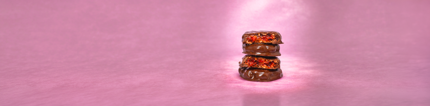Chocolate negro que esconde un corazón suave de membrillo, creando un contraste equilibrado y sorprendente en cada bocado.